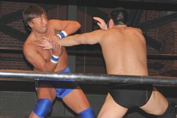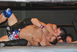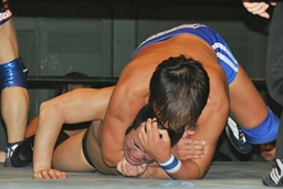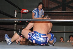関根ロープに振る、TAKA切り返してジャストフェースロック(右写真)、