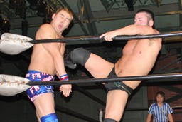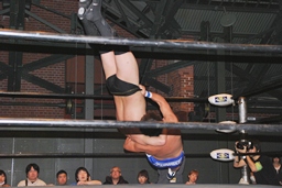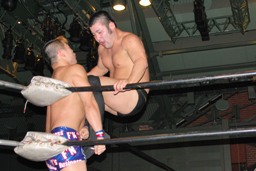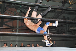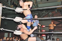 関根と真霜サンドイッチサッカーボールキック(右写真)、関根コーナーに上る、真霜がスローイングプレス、カウント2。