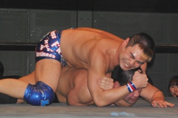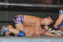 腕の取り合い、FUNAKIが腕をひねる(左写真)。関根切り返しイェエルボースタッブ、アームブリーカー。FUNAKIショルダーブロック、関根が突っ込んでくると鮮やかなアームドラッグ。両軍タッチ。