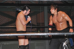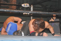 FUNAKIスリーパー、ネックブリーカードロップ、TAKAにタッチ。TAKAもスリーパー(左写真)、関根ロープ。