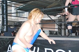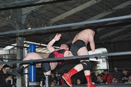 アントンと船越2人でディーノにガットショット、コーナーに振って串刺しラリアット連発。アントンディーノにパンチ(左写真)。