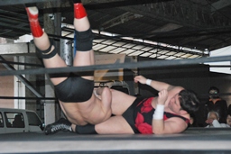 ディーノキス、船越ブロック、ニーリフトから卍固めに(右写真)、体勢崩れる。