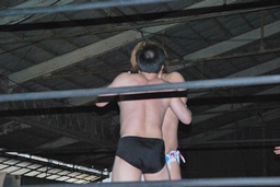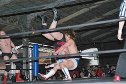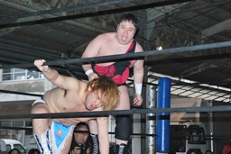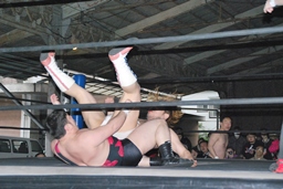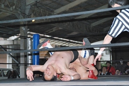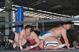 船越アームホイップ、アントンヘッドシザーズ(右写真)。再度ロックアップ、今度はアントンがヘッドロック、船越ロープに振る、アントンショルダーブロック。ロープに振ってヒップトス、船越ブロック、ボディスラムからカバー、ディーノがカット。