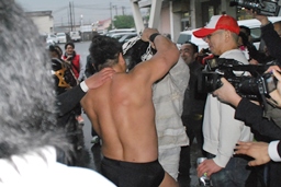 高木リングに戻る。しかし裁定はノーコンテスト。XXがイスを投げつける(右写真)。