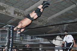 イホがコーナーからダイビングボディプレス(右写真)、Xがカット。4人場外に。
