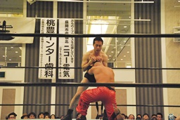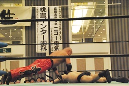 大柳エルボースマッシュ(右写真)、卍固め狙う、野橋ブロック。