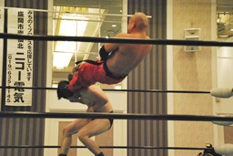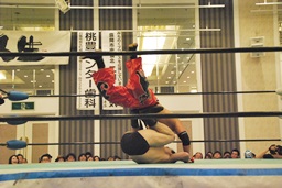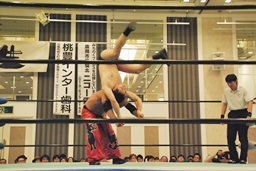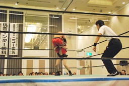 野橋コーナーに上ってダイビングヘッドバット(右写真)。