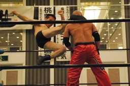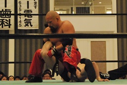 大柳バック取る、野橋急所蹴りから足を掛けて丸め込む(左写真)、カウント3。