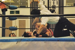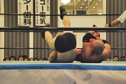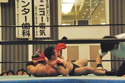 野橋十字架固め狙う、大柳片エビ固めに切り返す(右写真)、カウント2。