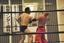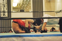 野橋対角線コーナーに振る、大柳切り返して突っ込む、野橋ショルダースルー、大柳エプロンに着地するとロープをはさんでのコブラツイストに(右写真)。