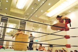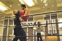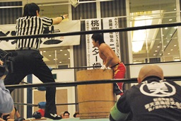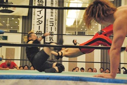卍丸拳王に串刺しエルボー(右写真)。