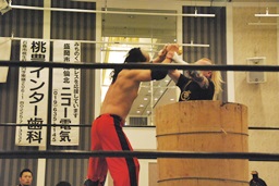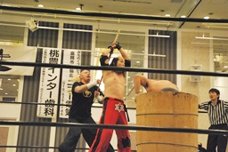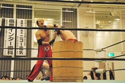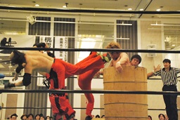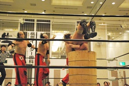 代わりにダブルのブレーンバスターの形で大地を和桶に入れる(右写真)。