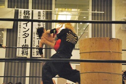 シュウが和桶の蓋を持ってコーナーに上る(右写真)。