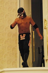サスケ「俺のパートナーのXだが、正直昨日の夜までは決まっていなかった。昨日の夜この会場を降りたところにあるBig Boyのウェイターさんを見て決めた。」(右写真)