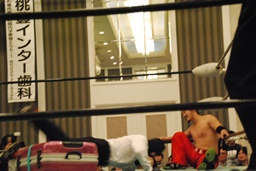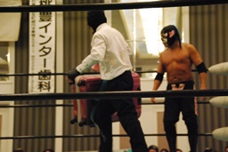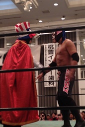 リングに上がるとサスケと2人で「I Want You!」を繰り返すMr.Pussy(右写真)。アンクル・サムがモチーフ?サスケに先発を促し自分はエプロンに。