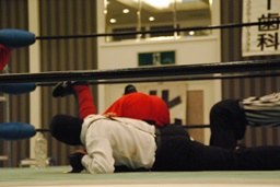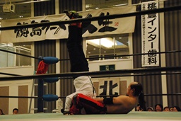 シュウヘッドロックからフライングメイヤー、Pussyヘッドシザーズでブレーク。Pussyフライングメイヤー、シュウヘッドシザーズ(左写真)。