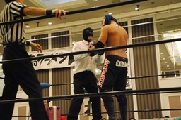 サスケのパートナー、Mr.Pussyが入場。手にはアメリカ国旗(左写真)。しかしこの体型、アゴヒゲ、そしてオープンフィンガーグローブ。明らかに見覚えが・・・