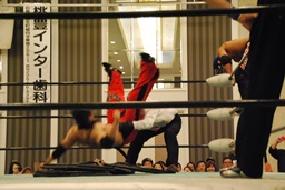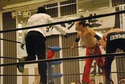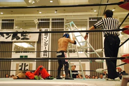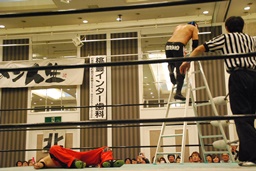 ラダーを場外に出してコーナーに上る、さすがにシュウ待てずに立ち上がりパンチ(左写真)。