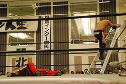 サスケはシュウを首投げ、ラダーをセットして上る(右写真)。