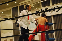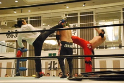 サンドイッチバズソーキック(左写真)、シュウがカバー、カウント3。