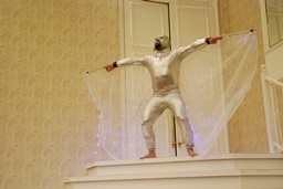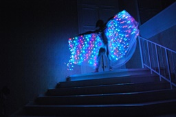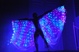 場内暗転、光に包まれて踊る宇宙東林寺(左写真)。