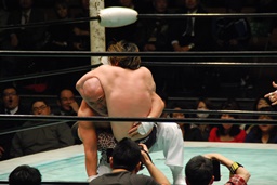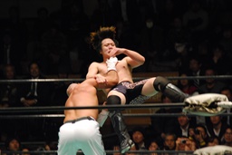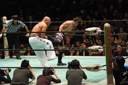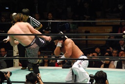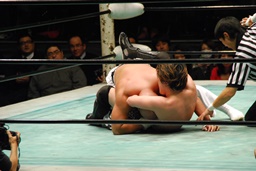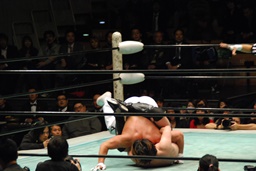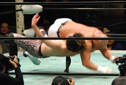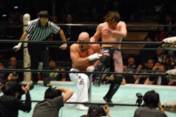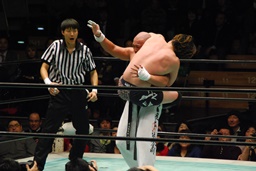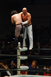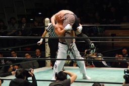 ノドをつかんでチョークスラム(右写真)。20分経過。