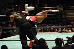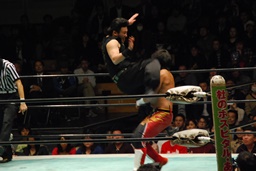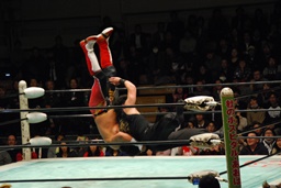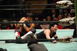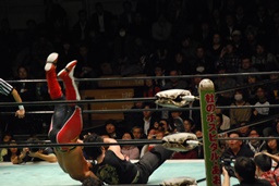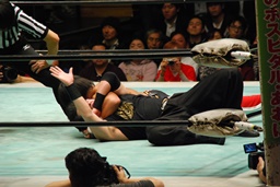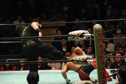 ソバット、ジャンピングDDT(右写真)、カウント2。