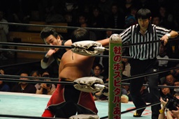 ロープ越しにビッグブーツ、南野かわす(左写真)。