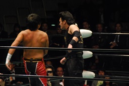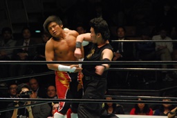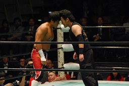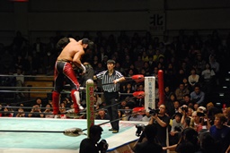 南野ヘッドバット、拳王張り手(左写真)、場外へのブレーンバスターを狙う。