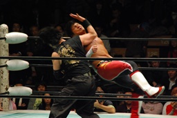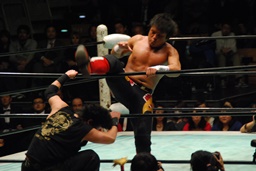 拳王首投げからサッカーボールキック(左写真)、カウント2。