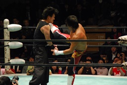 拳王ミドルキック、南野キャッチしてエルボー、拳王かわしてミドルキック(左写真)。