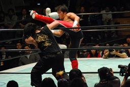 ゴングすぐに南野が先制のスタンディングシャイニングウィザード(左写真)。