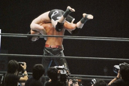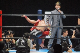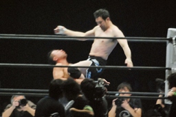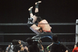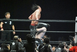 桜庭足にキック、ジャンプして(左写真)中邑の顔面にフットスタンプ、中邑辛うじてかわす。