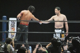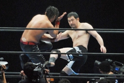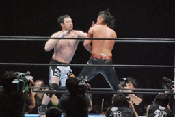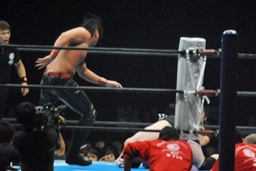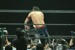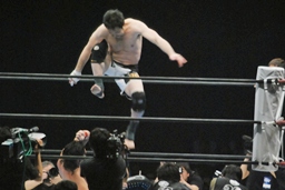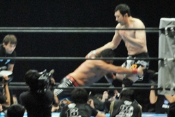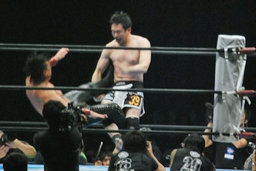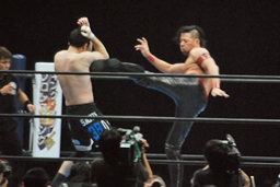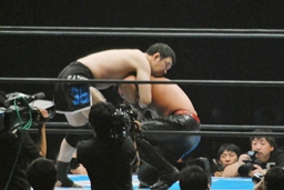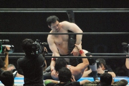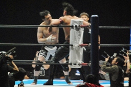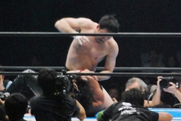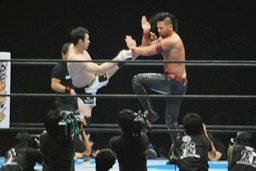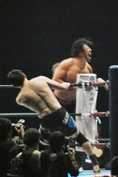 立ち上がってがぶる(左写真)。桜庭ヒザ蹴り、中邑ロープに。そのまま場外エスケープ。