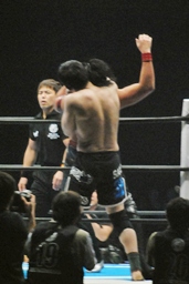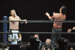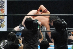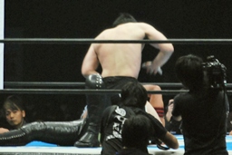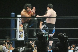 頭を着けた状態から桜庭がバック取る(右写真)、中邑ロープブレーク。