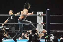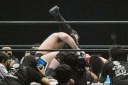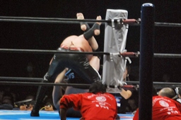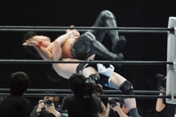 コーナーに乗せてヒザ蹴り狙うが桜庭かわしてエプロンに(右写真)。