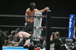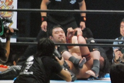 桜庭背後に回ってスリーパー(右写真)、中邑はコーナーに下がってブレーク。