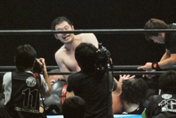 勝者・中邑(左写真)。「イヤァオ!イヤァオ!イヤァオ!たぎったぜ!プロレスラーは強い、総合も強い。だからこそこの言葉が生きて来るんだ。一番凄いのはプロレスなんだ!」