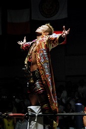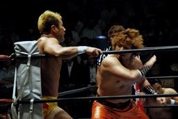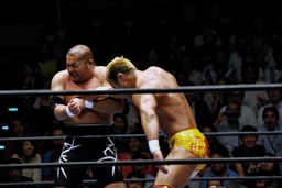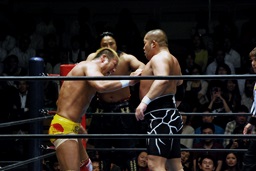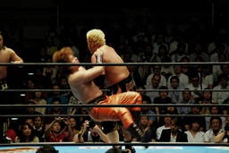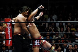 ダブルチョップで石井を倒す(右写真)。コーナーに振って串刺しエルボーからフェースクラッシャー。