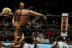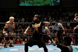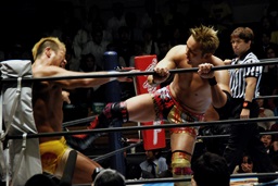 オカダドロップキック(右写真)。YOSHI-HASHIにタッチ。YOSHI-HASHI串刺しラリアット、ロープに飛んでヘッドハンター、カウント2。