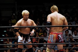 と思いきやオカダはすぐにYOSHI-HASHIにタッチ(右写真)。