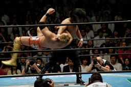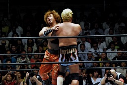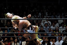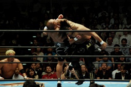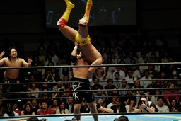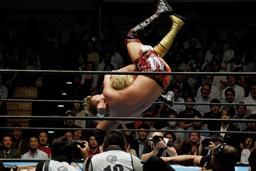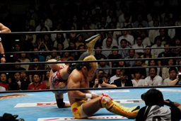 後藤ラリアット(右写真)、串刺しニールキック、バックドロップ、カウント2。