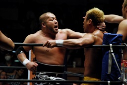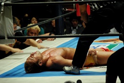 真壁ショルダーブロックで吹っ飛ばす(右写真)。ボディスラム、本間にタッチ。本間ストンピング、YOSHI-HASHIサミング、石井にタッチ。