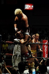 オカダにデスバレーボム(左写真)。しかし外道がオカダを救出。6/22は面白くなりそうだなあ。