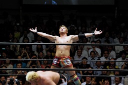 IWGPヘビー級現王者、オカダ・カズチカ入場(左写真)。