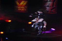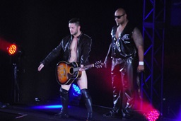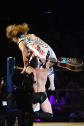 棚橋がいつものようにコーナーに上ってポーズ取ってると背後からデヴィットがアコギで襲う(右写真)。