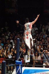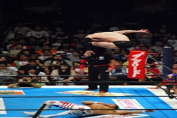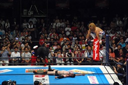 ボディスラム、コーナーに上って背中へのハイフライフロー(左写真)。