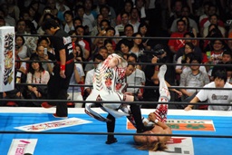 エビ固めに(左写真)、カウント2。5分経過。