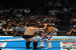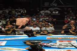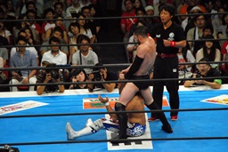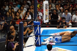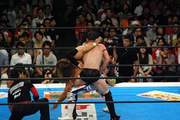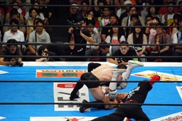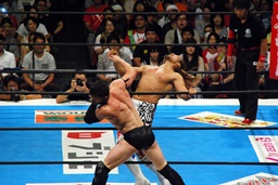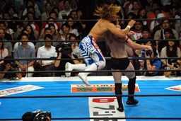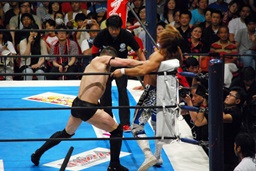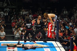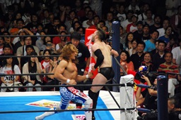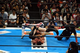棚橋コーナーに振って突っ込む、デヴィットかわしてエプロンに出るとバックエルボー(左写真)。デヴィットスワンダイブ狙う、棚橋突き落とす。