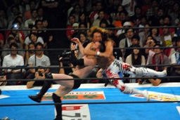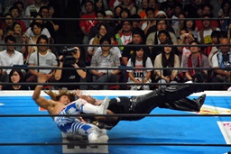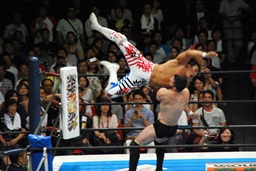 棚橋ロープに振る、デヴィット切り返すが棚橋はフライングフォアアーム(左写真)。